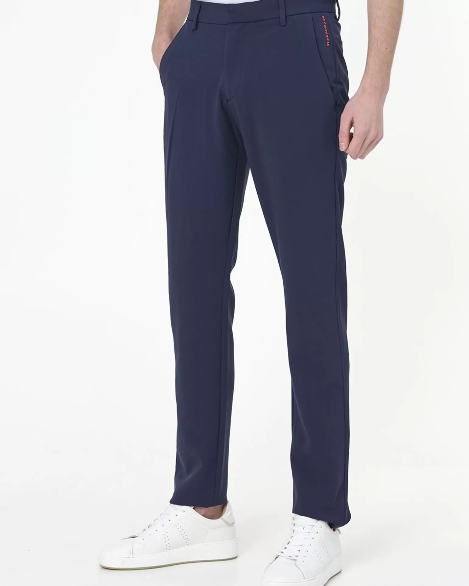 Alles Over Dit Product Deze Donkervoort Chino Is Een Fijne Broek Met Hoog Draagcomfort. De Chino Bestaat Namelijk Uit 90% Polyester En 10% Elastaan Waardoor Het Een Flexibele Stof Is Die Glad Aanvoelt. De Chino Heeft Twee Steekzakken Voor, Met Aan De Linkerkant Een Extra Zakje Met Ritssluiting. Ook Heeft Het Twee Paspelzakken Achter, Waarvan De Een Een Ritssluiting Heeft En De Ander Niet. De Sluiting Van De Chino Bestaat Uit Een Drukknoop En Rits. Verder Heeft Het Riemlussen En Een Rood Detail Met De Tekst ”No Compromise”. Door De Felle Kleur Van Dit Accent Staat Het Mooi Af Tegen De Neutrale Effen Kleur Van De Chino. Dit Geeft Een Mooie Touch En Maakt De Chino Helemaal Af. Combineer De Chino Mooi Met Een Overhemd Voor Een Casual Chic Look.