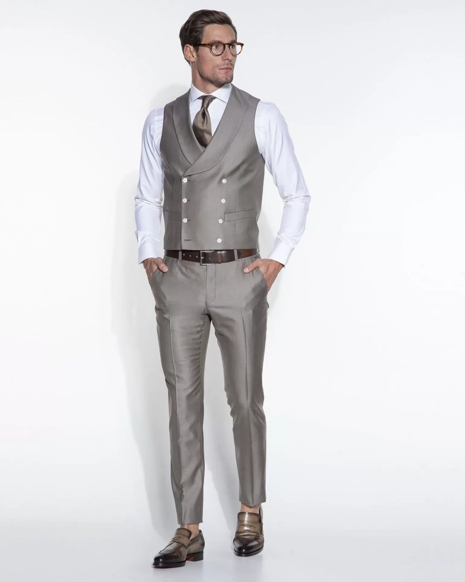 Een Trouwkostuum Van Dutch Dandies. Dit Kostuum Heeft Een Slim Fit Pasvorm. Het Colbert Is Voorzien Van Twee Klepzakken En Een Borstzakje Aan De Voorzijde En Heeft Drie Binnenzakken. Daarnaast Heeft Het Colbert Een Dubbele Split Aan De Achterkant. Het Gilet Heeft Twee Steekzakken, Een Borstzak En Een Vijfdubbele Knoopsluiting. De Pantalon Heeft Twee Zakken Met Knoopsluiting Aan De Achterzijde En Twee Steekzakken Aan De Voorzijde. De Pantalon Sluit Met Twee Knopen En Heeft Een Haakrits-Sluiting.In De Dutch Dandies Wedding Collectie Vind Je Prachtige Driedelige Trouwkostuums In Verschillende Kleuren. De Kostuums Hebben Een Champagnekleurige Voering En Parelmoerkleurige Knopen. Er Wordt Gebruik Gemaakt Van De Beste Originele Stoffen Van Di Fabio, Guabello En Reda.